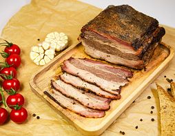 Копчёное говяжье сало – пряный аромат и нежность мраморного мяса Отборная грудина мраморной говядины, натёртая смесью чеснока, кориандра, кайенского и чёрного перца, мед...